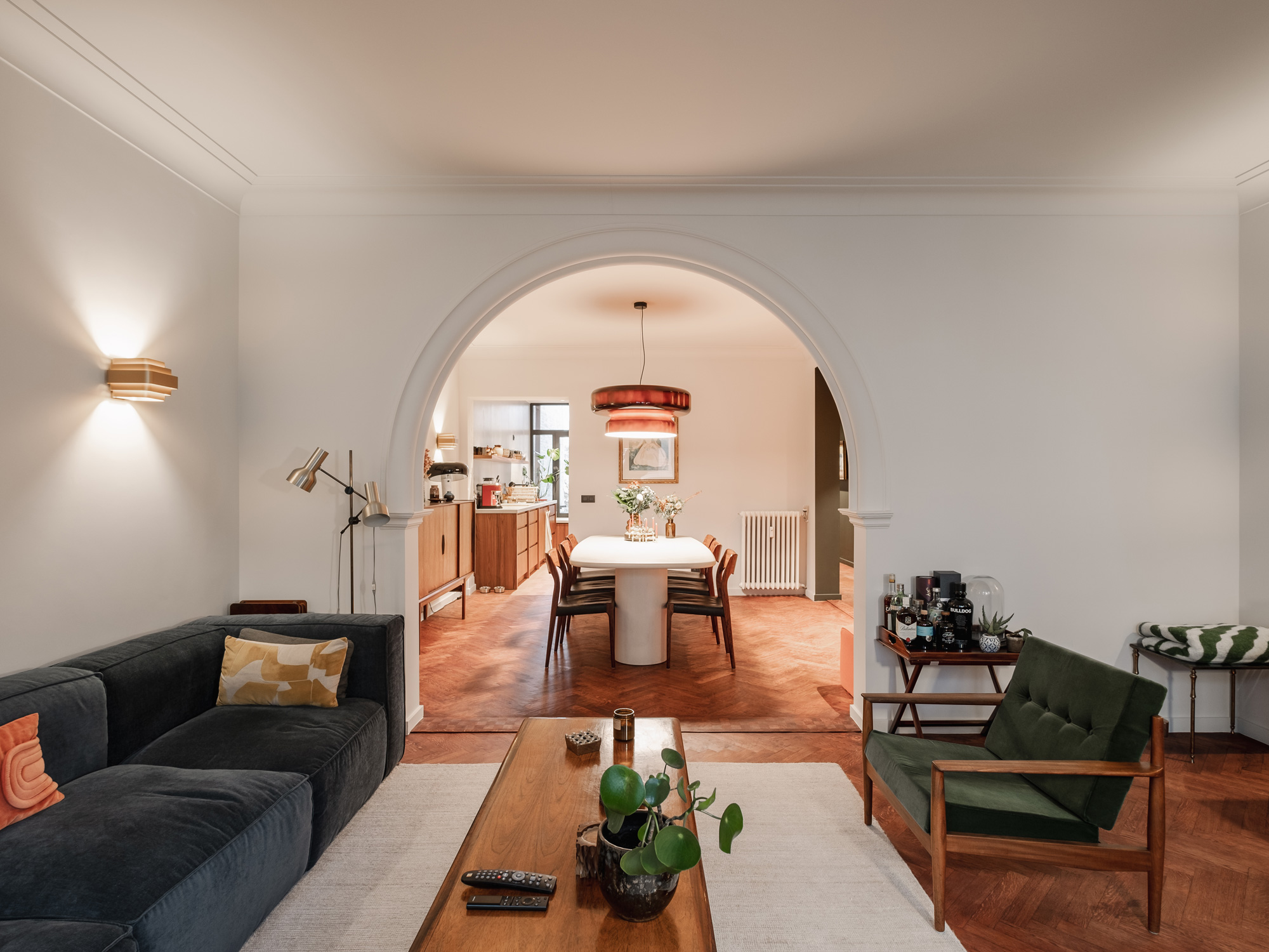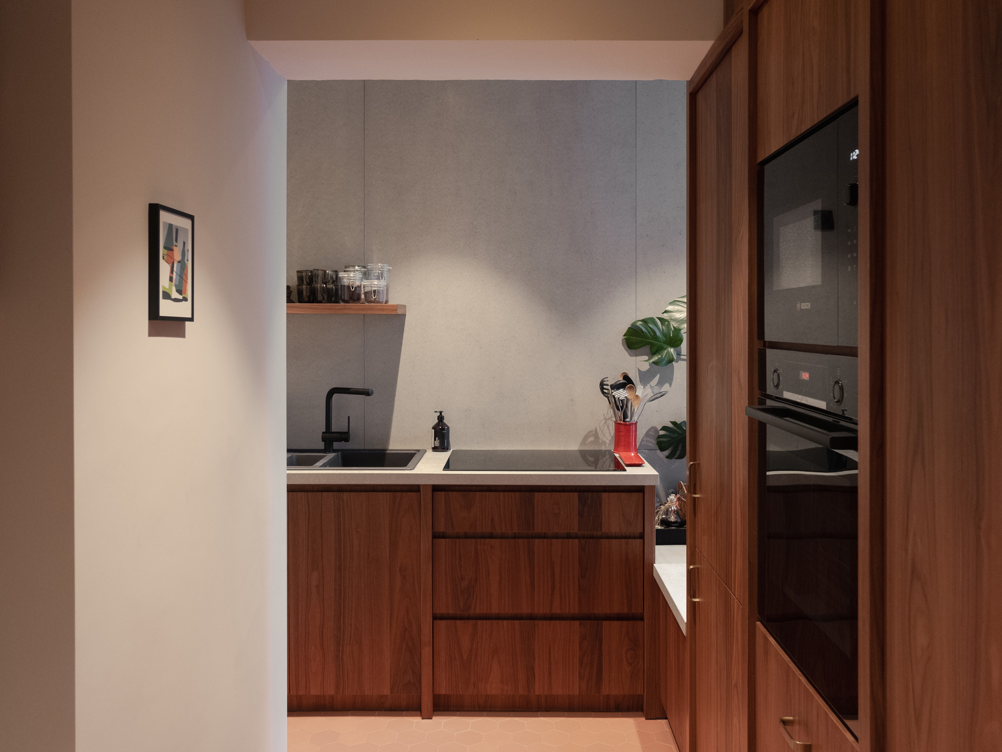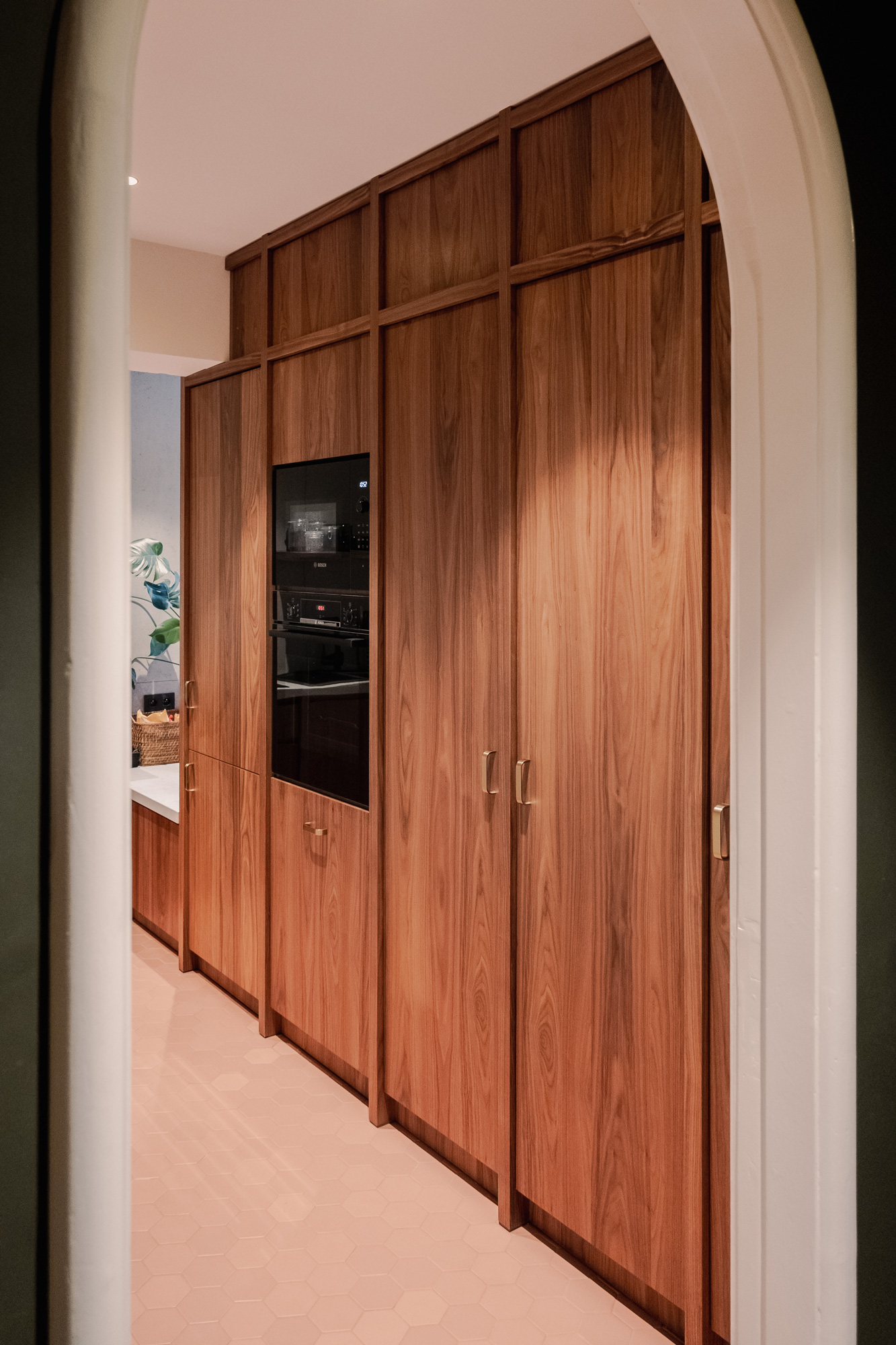 Le client souhaitait repenser entièrement son appartement. Les pièces existantes ne correspondaient plus à ses usages et il fallait rendre l’espace plus cohérent, plus fluide, lui assurant une vraie logique de vie au quotidien. Il voulait pouvoir circuler naturellement entre la cuisine, la salle à manger et le salon, sans couloirs ni espaces perdus. La cuisine allait devenir le cœur de l’appartement: un point de rencontre, visible depuis partout, autour duquel tout s’organise. Nous avons imaginé des matières brutes et chaleureuses: du noyer, du béton, un sol en chêne teinté.