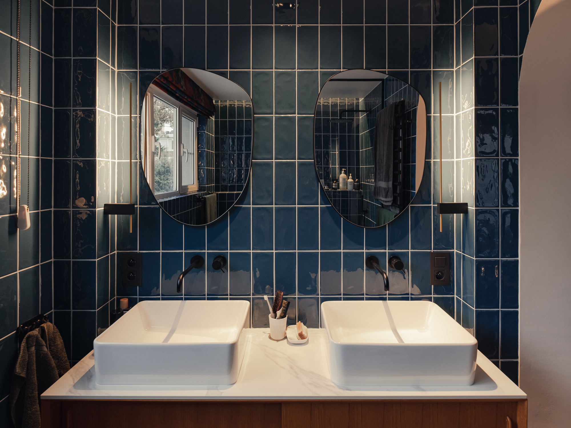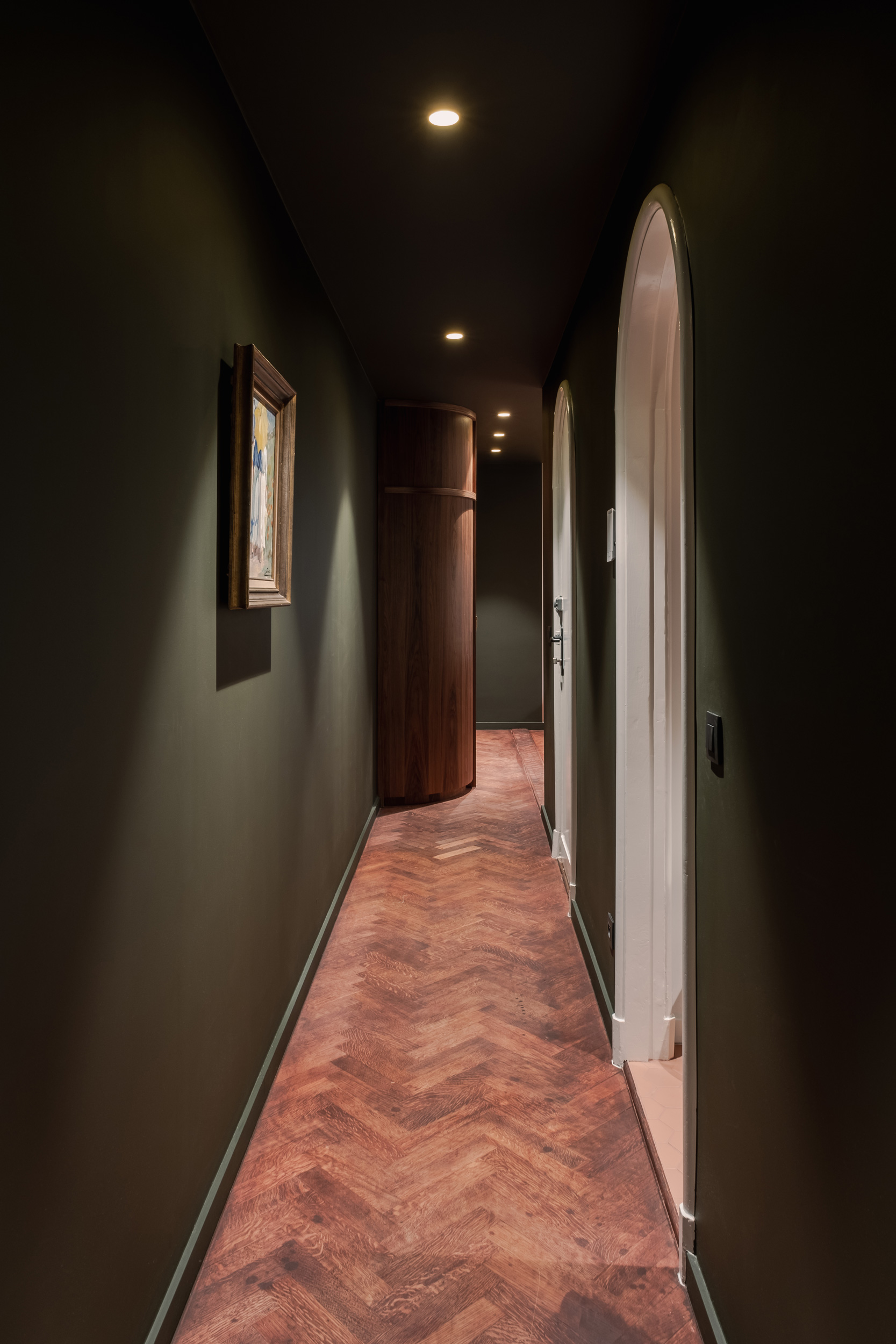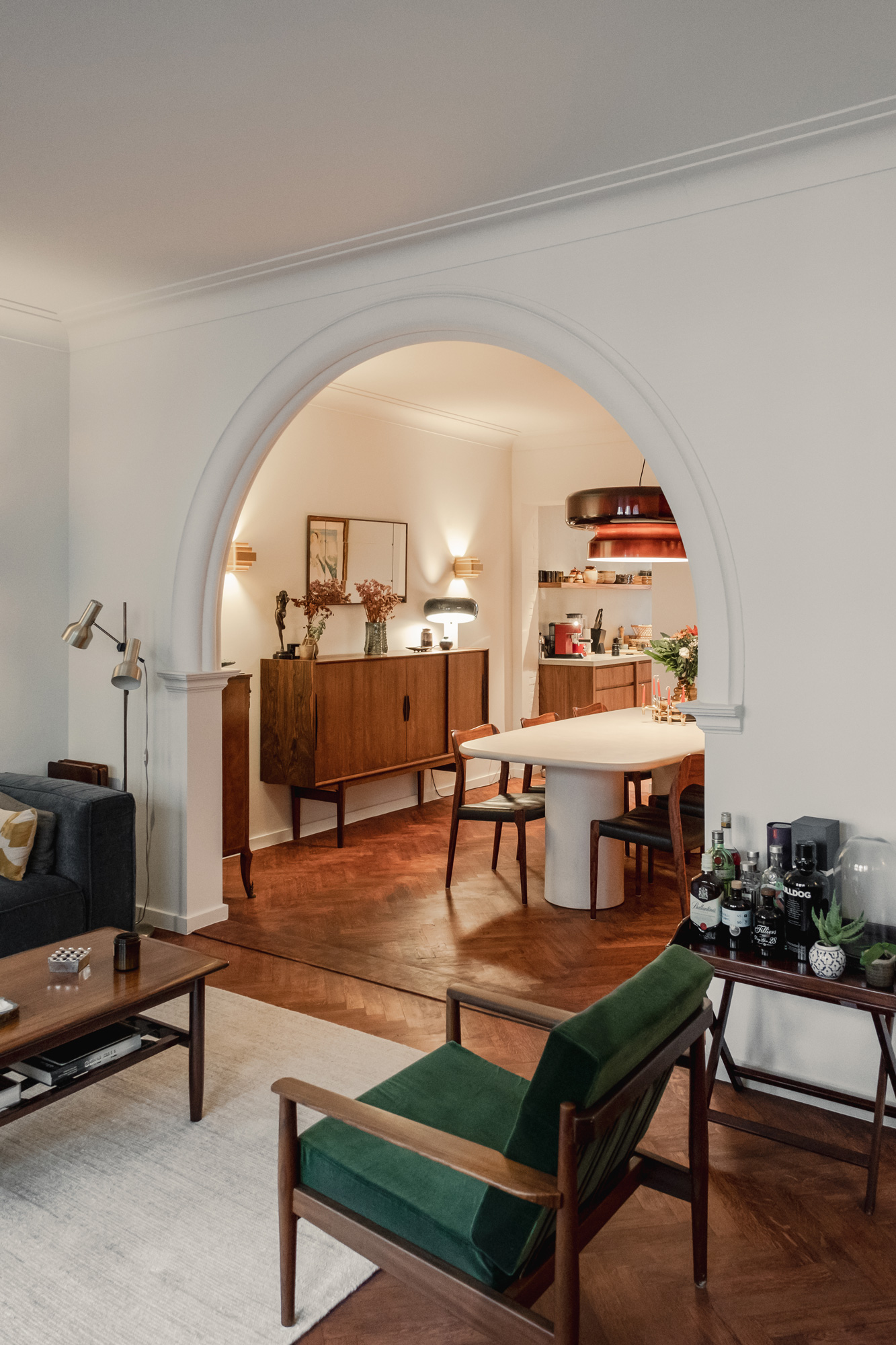 Le client souhaitait repenser entièrement son appartement. Les pièces existantes ne correspondaient plus à ses usages et il fallait rendre l’espace plus cohérent, plus fluide, lui assurant une vraie logique de vie au quotidien. Il voulait pouvoir circuler naturellement entre la cuisine, la salle à manger et le salon, sans couloirs ni espaces perdus. La cuisine allait devenir le cœur de l’appartement: un point de rencontre, visible depuis partout, autour duquel tout s’organise. Nous avons imaginé des matières brutes et chaleureuses: du noyer, du béton, un sol en chêne teinté.