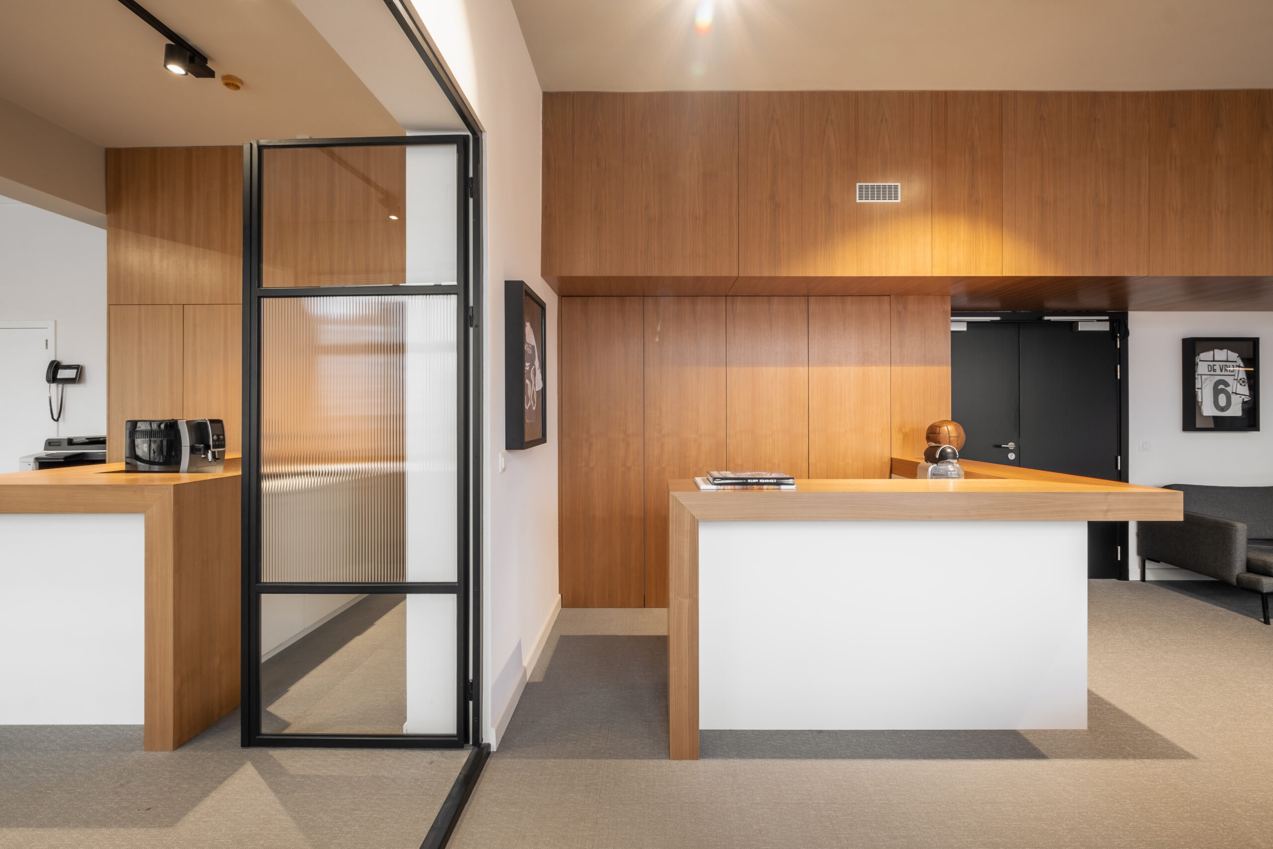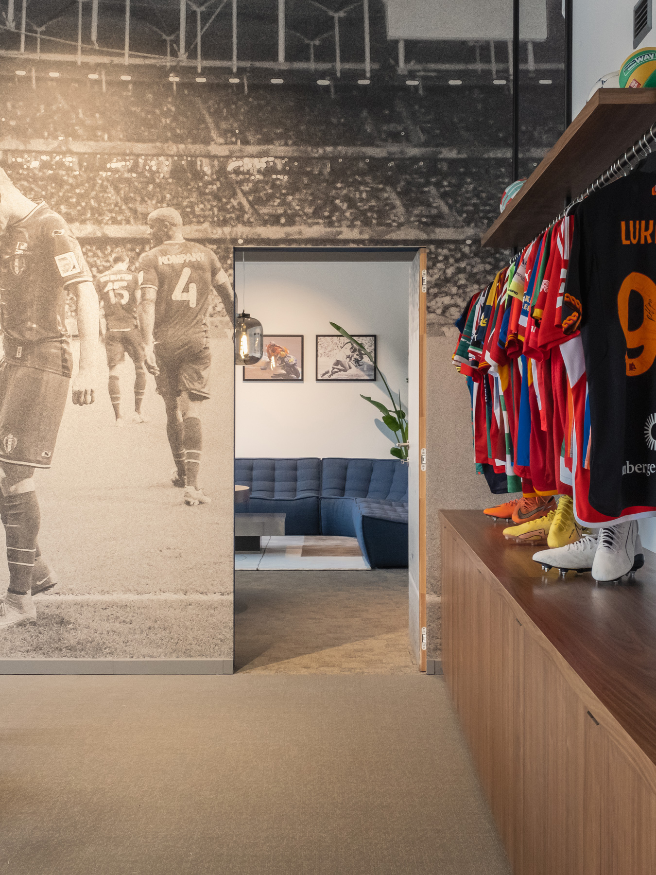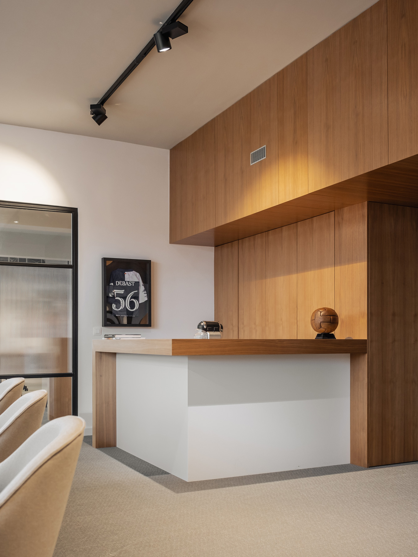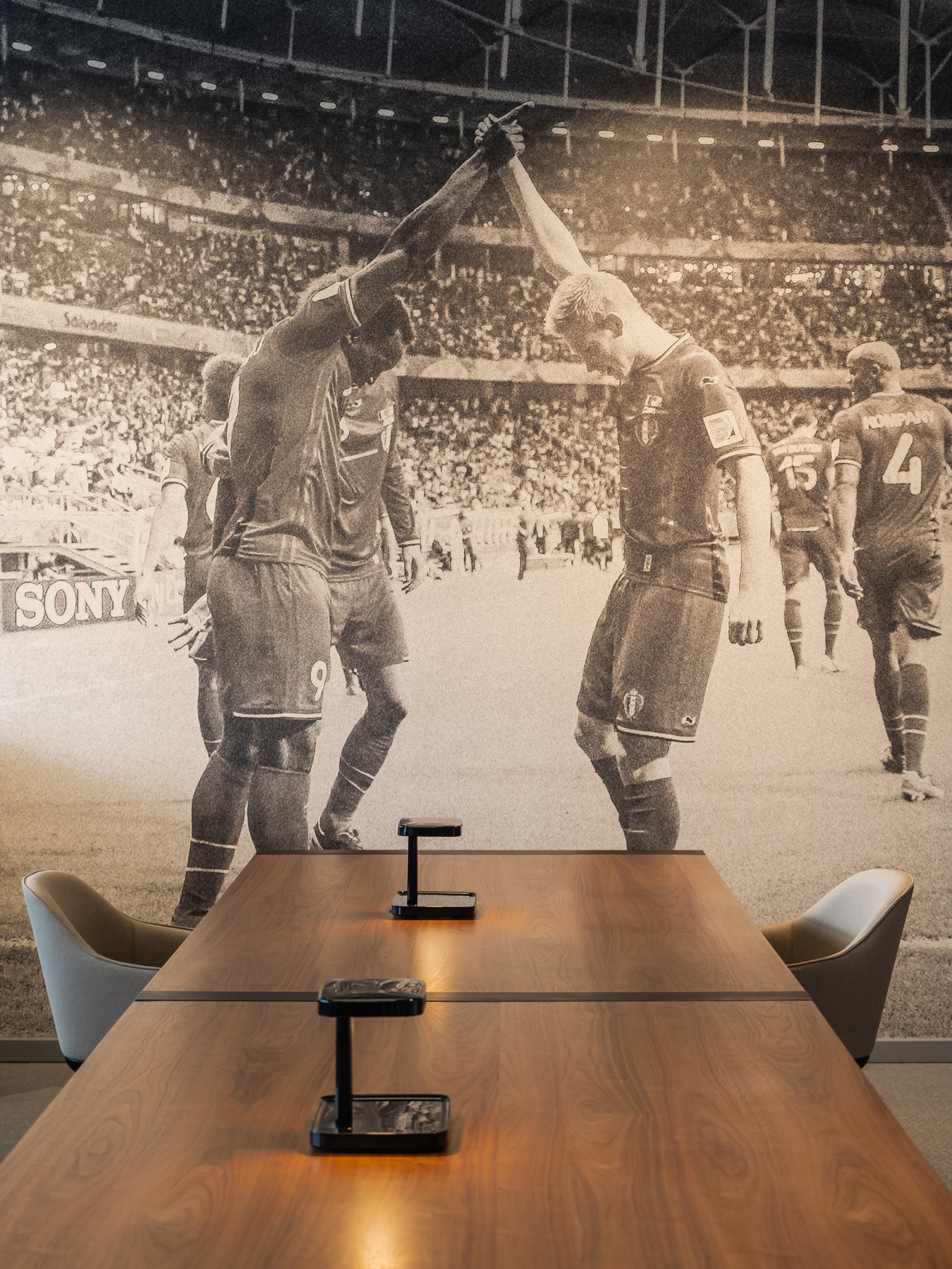 Installés dans le bâtiment Flagey à Ixelles, ils tenaient également à respecter l’esprit Art Déco du lieu. Nous avons donc privilégié des lignes inspirées des paquebots, très années 20, et une certaine élégance cinématographique: les clients évoquaient l’univers de Mad Men, doux mélange de rigueur, de caractère et de chaleur nostalgique. L’ambiance devait aussi rappeler celle d’une loge dans un stade: un espace confidentiel où les décisions se prennent à l’abri du bruit et de la cohue. Nous avons opté pour des matières nobles comme le noyer et réalisé un papier peint sur mesure, inspiré de l’univers du sport.