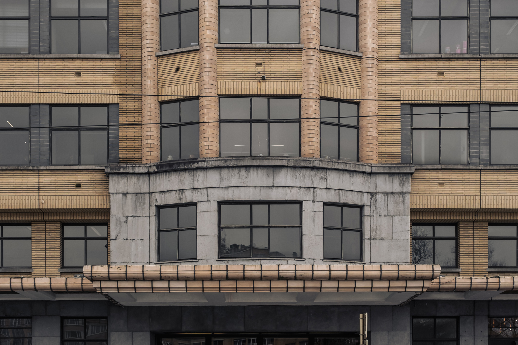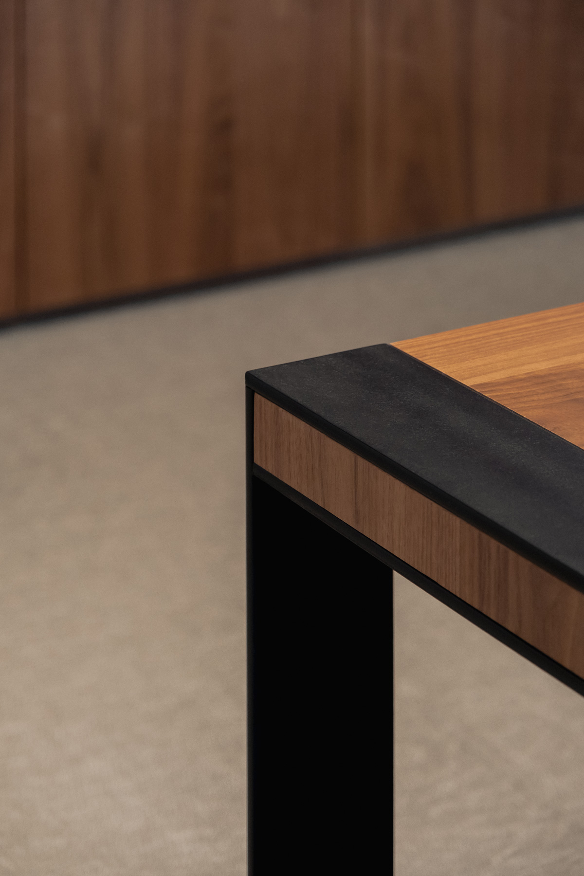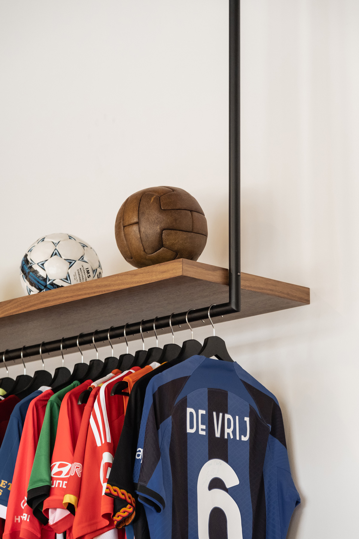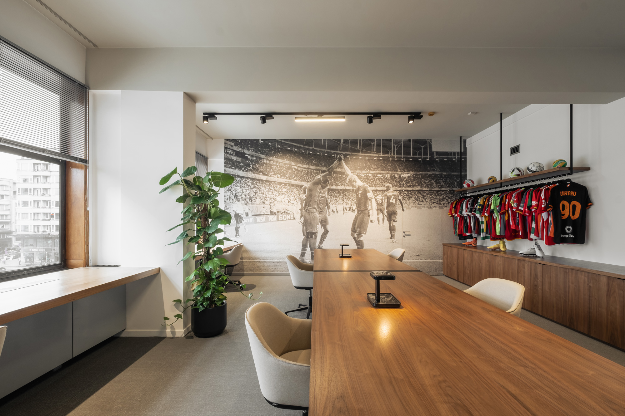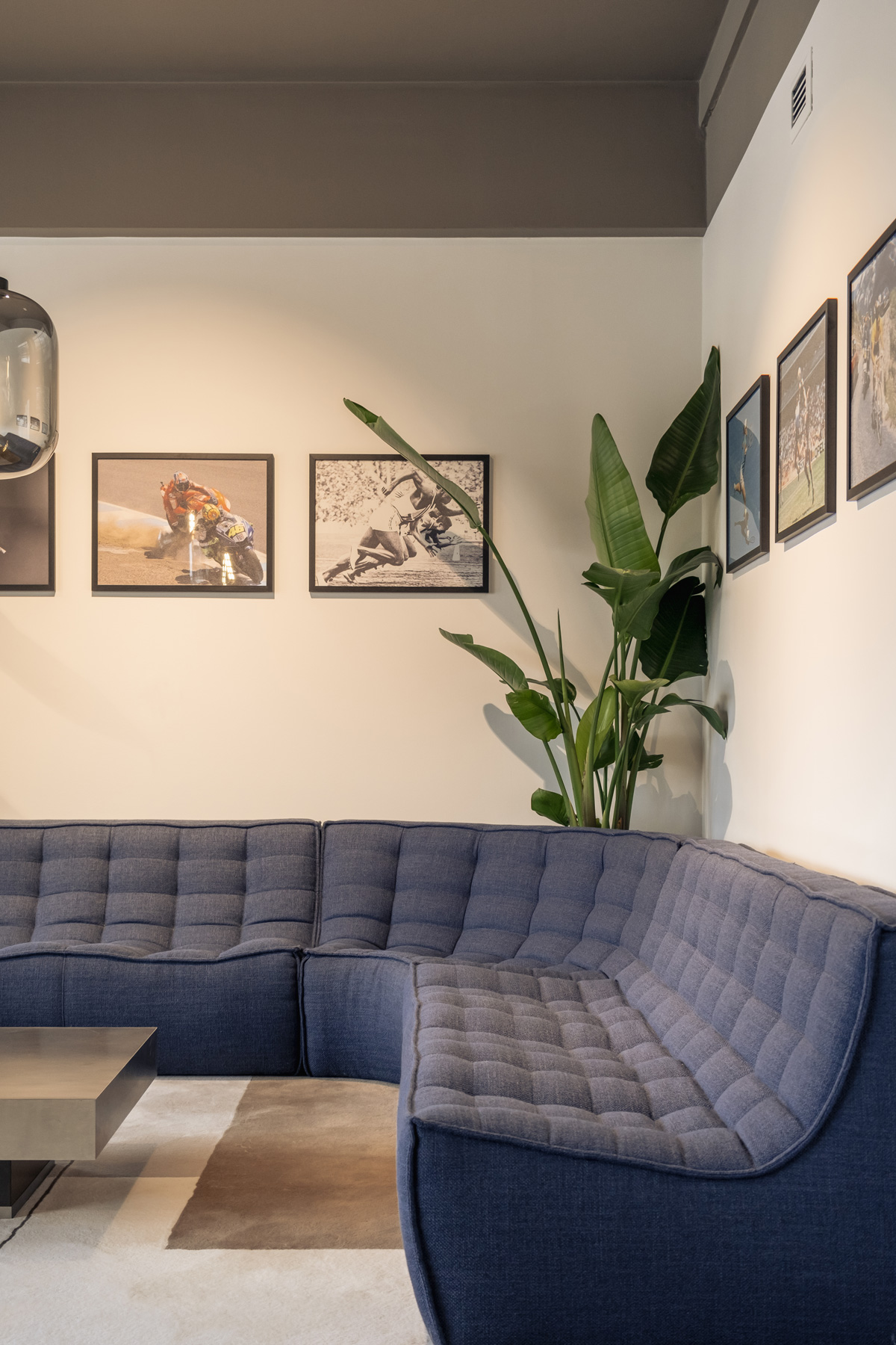 Installés dans le bâtiment Flagey à Ixelles, ils tenaient également à respecter l’esprit Art Déco du lieu. Nous avons donc privilégié des lignes inspirées des paquebots, très années 20, et une certaine élégance cinématographique: les clients évoquaient l’univers de Mad Men, doux mélange de rigueur, de caractère et de chaleur nostalgique. L’ambiance devait aussi rappeler celle d’une loge dans un stade: un espace confidentiel où les décisions se prennent à l’abri du bruit et de la cohue. Nous avons opté pour des matières nobles comme le noyer et réalisé un papier peint sur mesure, inspiré de l’univers du sport.