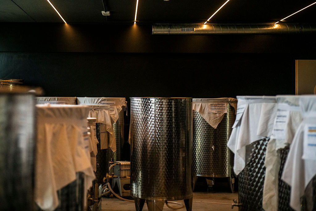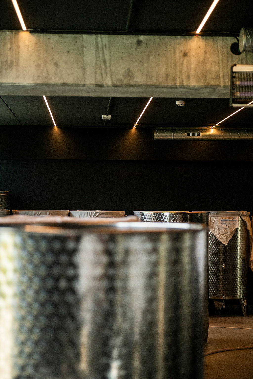 Nous avons imaginé que les cuves, habituellement purement techniques, seraient au cœur du parcours emprunté par les visiteurs et les usagers. Nous voulions les montrer, les rendre presque théâtrales. L’univers des lieux allait rester industriel, brut, assumé, usant de matières franches: de l’acier galvanisé, de l’inox, du verre. Une peinture noire viendrait renforcer les contrastes et guider le regard.